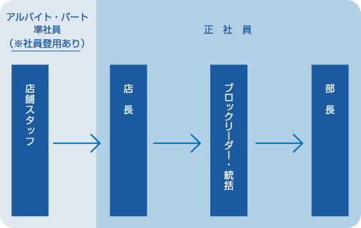 入社後は、まず店舗スタッフとしてレジや陳列、清掃などの基本業務をお願いします。仕事に慣れてきたら店舗マネージャー、店長としてスタッフの採用・教育や収支管理、発注などの商品管理業務を担当していただきます。いずれは複数店舗をマネジメントする統括や会社全体を取り仕切る本部長、さらには経営の舵取りをするポジションに就いていただけることを期待しています。